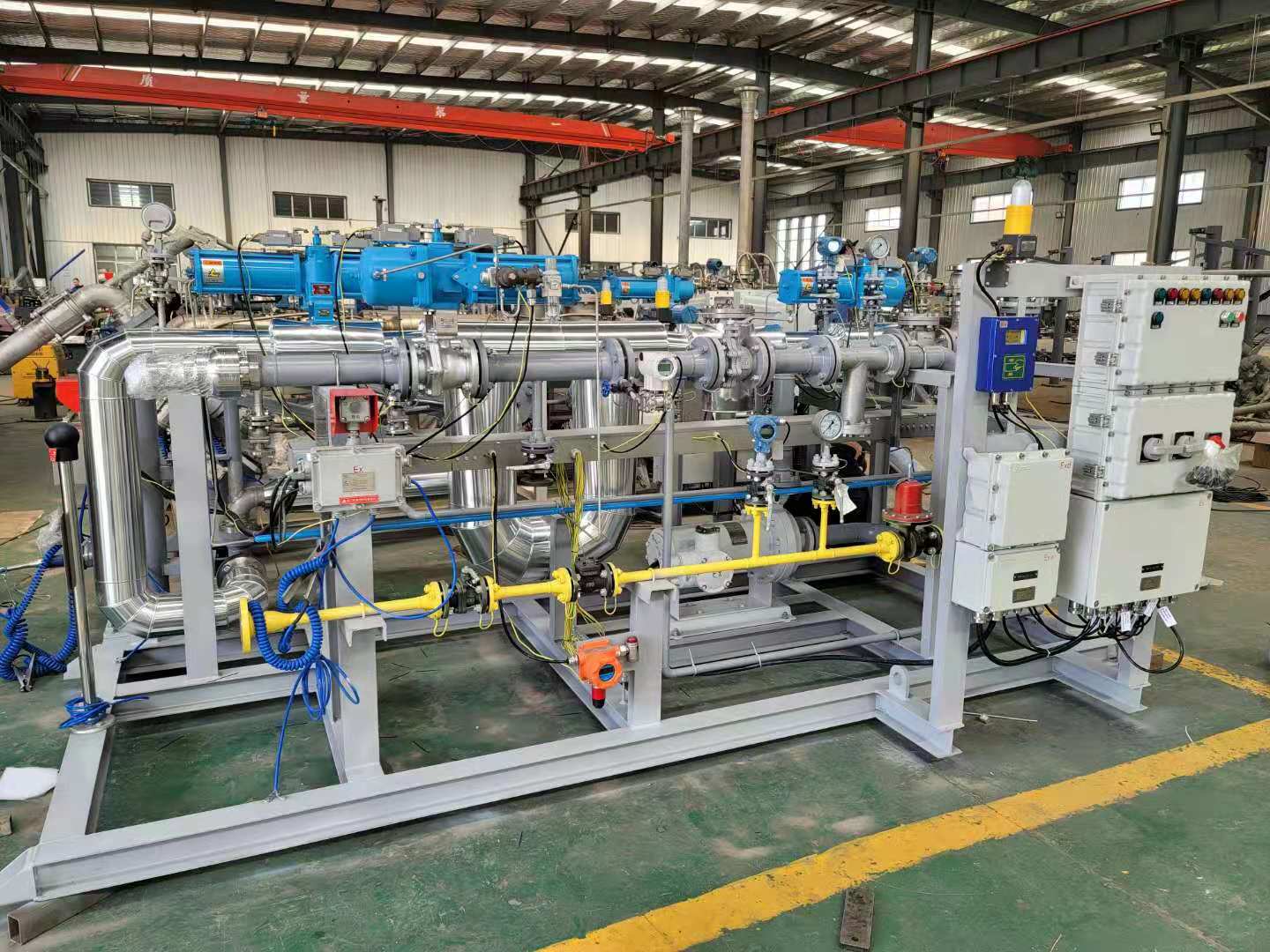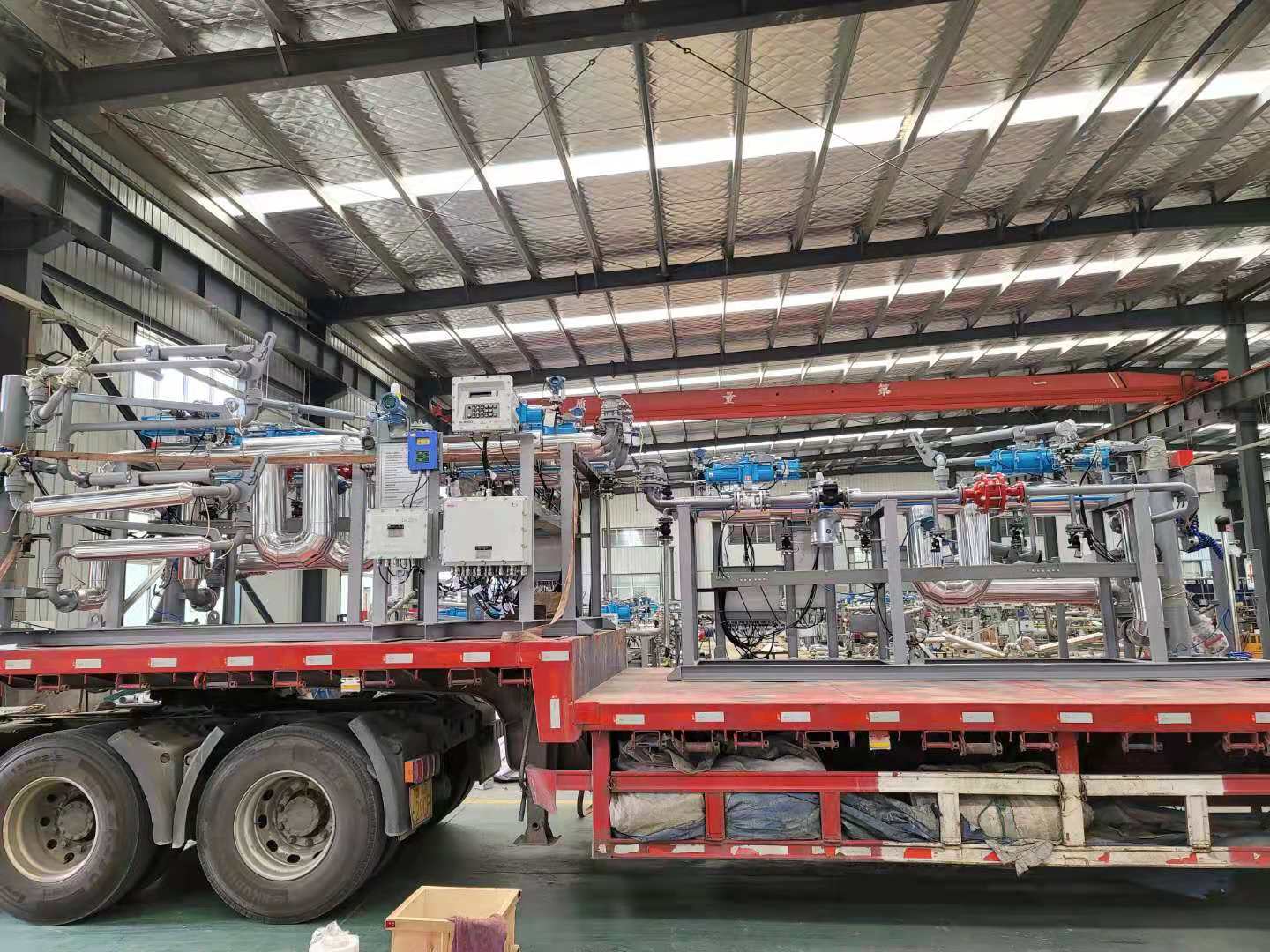 油品及化工品定量裝車(chē)橇裝組是指將每一個(gè)裝車(chē)鶴位內(nèi)的儀表和設(shè)備集成在一個(gè)專(zhuān)用的框架結(jié)構(gòu)內(nèi),儀表和設(shè)備包括裝車(chē)鶴管、流量計(jì)、防溢油靜電報(bào)警控制器、壓力變送器、裝車(chē)流量控制閥、緊急切斷閥,裝車(chē)泵、批量控制器等, 只預(yù)留工藝連接口和控制電源和通訊接口,這個(gè)整體集成部分稱(chēng)為裝車(chē)橇。與傳統(tǒng)的裝車(chē)控制系統(tǒng)就地組裝比較,裝車(chē)橇可以節(jié)省現(xiàn)場(chǎng)設(shè)計(jì)和現(xiàn)場(chǎng)施工量,縮短項(xiàng)目工期,提高裝車(chē)控制系統(tǒng)的質(zhì)量。以下是近期公司定量裝車(chē)撬的生產(chǎn)及發(fā)貨現(xiàn)場(chǎng)。
